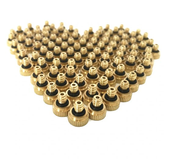 Features: Made of durable brass and stainless steel material Leak-proof, self-sealing o-ring included with each nozzle; No tape or sealant is required. The nozzle requires simple maintenance; soaking periodically in misting nozzle cleaner to remove mineral deposits that may accumulate with usage.   Included: 10 X Misting Nozzles 0.30 mm